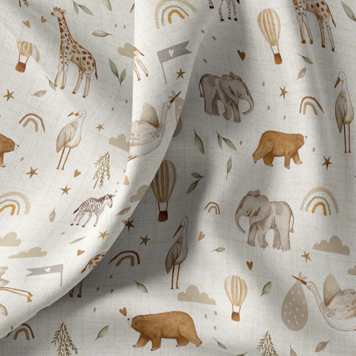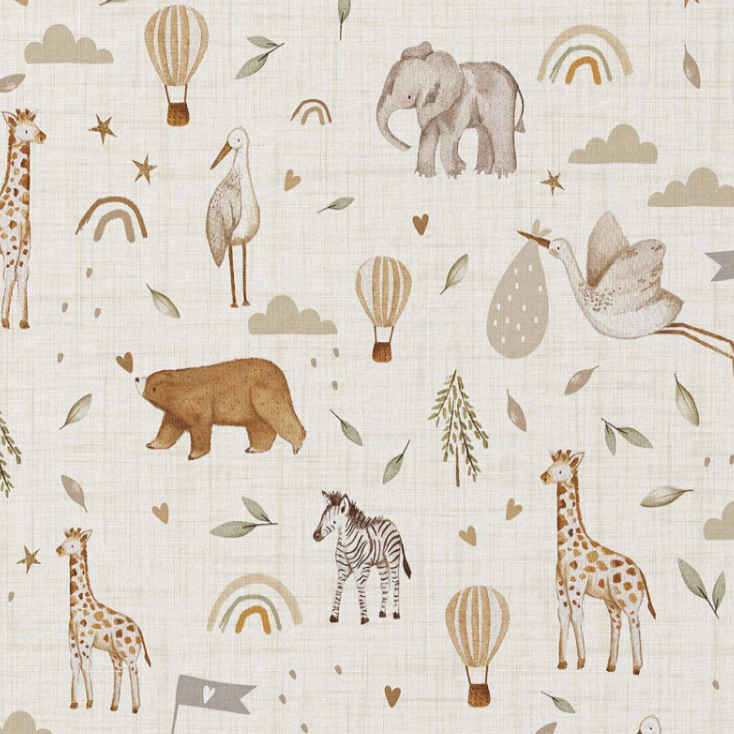 Feiner Webstoff mit Tieren, Ballon und Regenbögen.