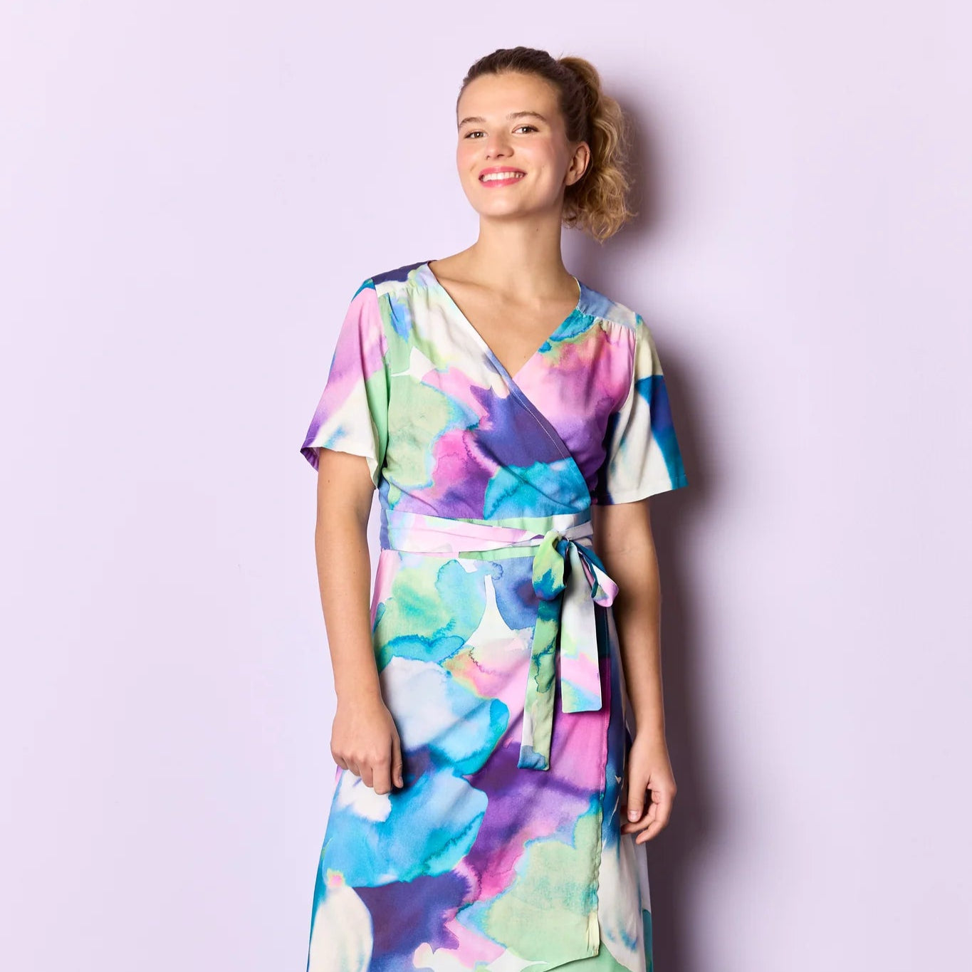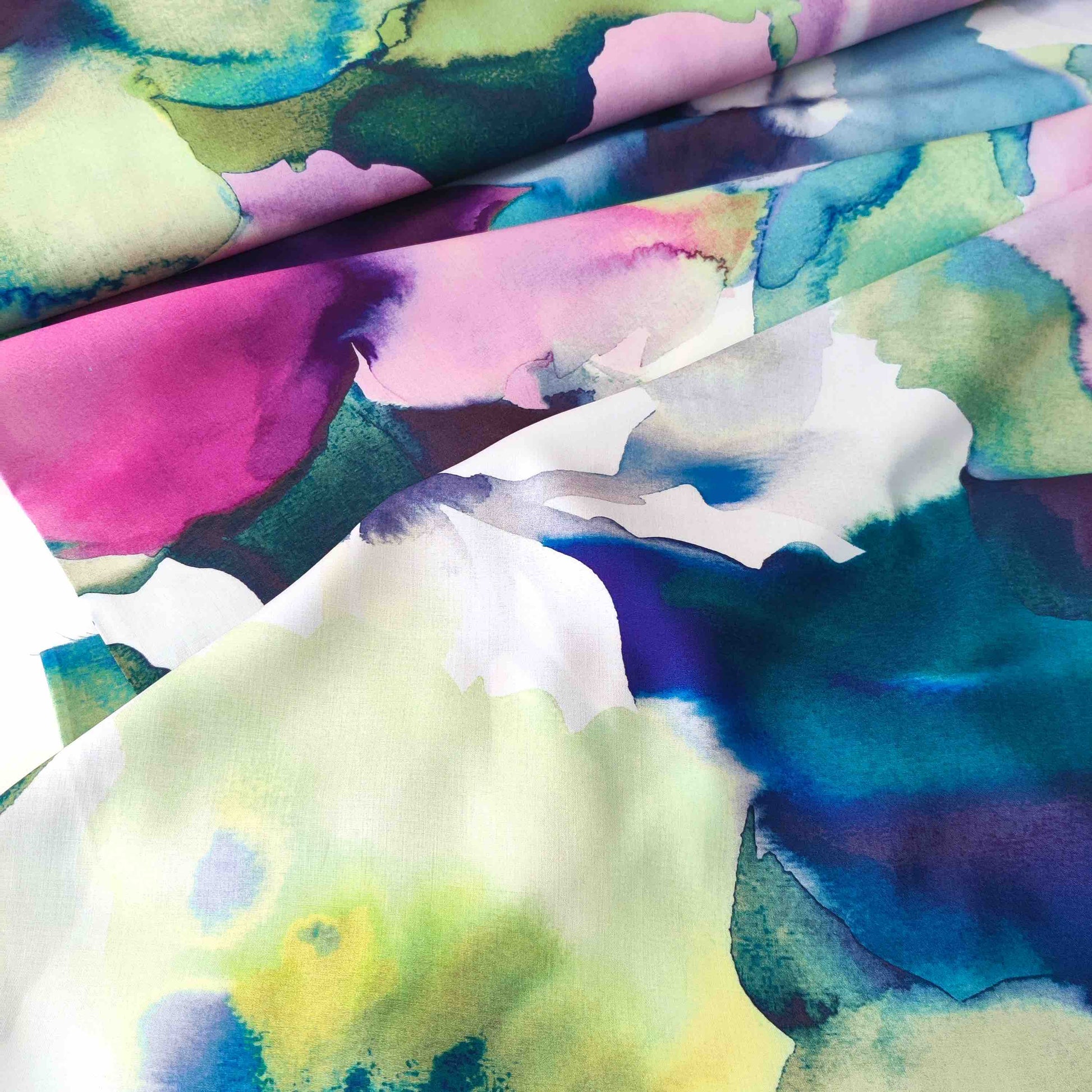 Ein weich fallender Viskosestoff mit zarten Aquarelltönen in Rosa, Grün und Blau – fast wie ein kleines Kunstwerk auf Stoff! Perfekt geeignet für feminine Blusen, luftige Kleider oder schwingende Röcke.