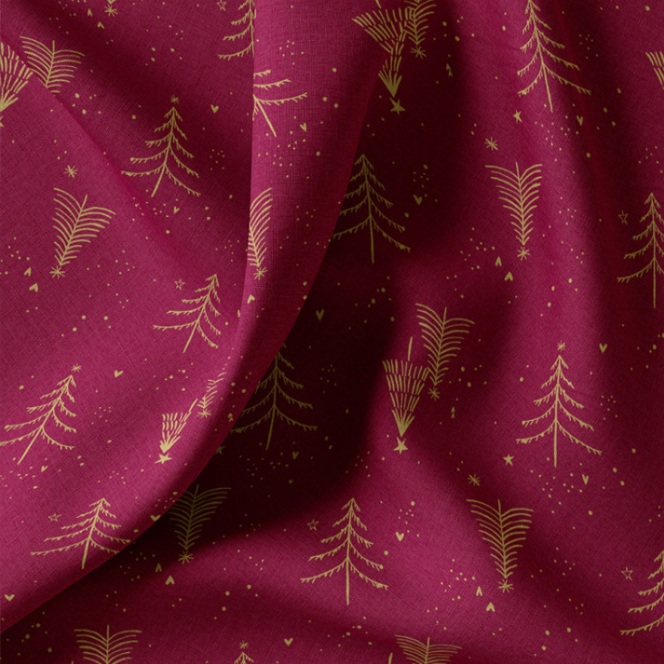 Dieser rote Weihnachtsstoff aus Baumwolle begeistert mit seinem edlen Foliendruck in Gold: kleine Weihnachtsbäume und feine Sprenkel verleihen ihm eine festliche Ausstrahlung. Die leicht gröbere Struktur sorgt für Stabilität und eine natürliche Haptik.